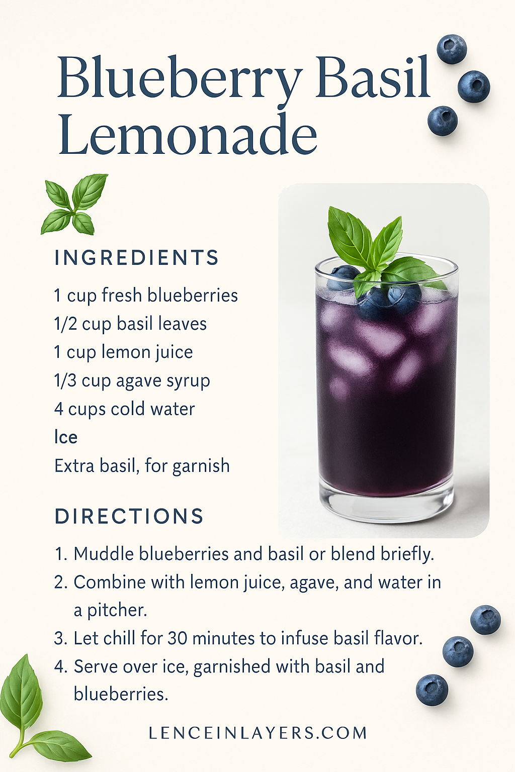 - Serve over ice, garnished with a sprig of basil and a few whole blueberries.