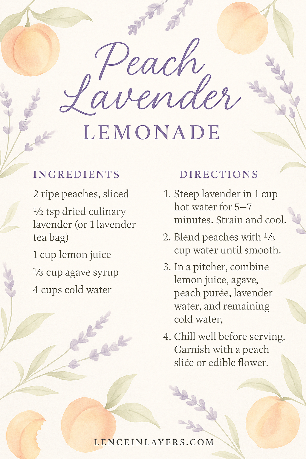- In a pitcher, combine lemon juice, agave, peach purée, lavender water, and remaining cold water.