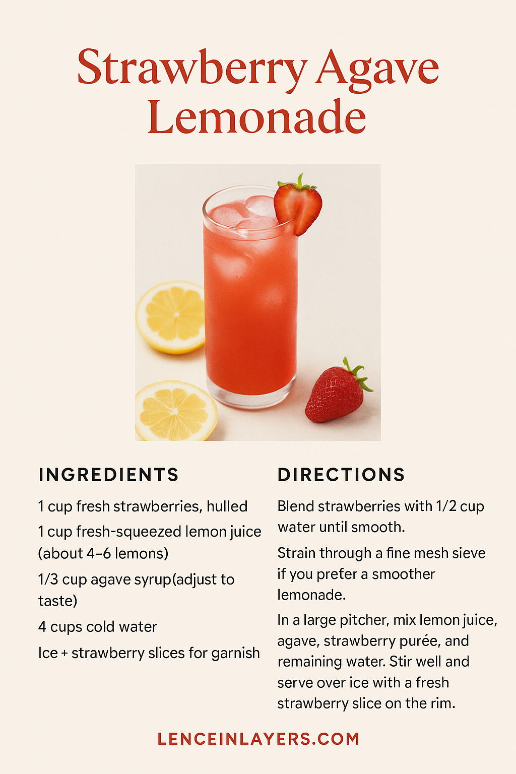 - In a large pitcher, mix lemon juice, agave, strawberry purée, and remaining water.
