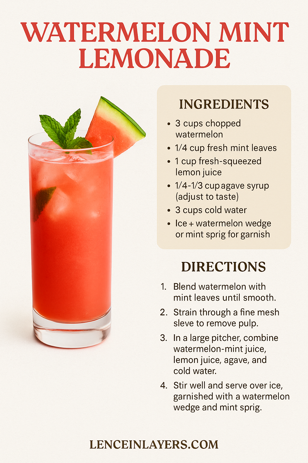 In a large pitcher, stir together the watermelon-mint juice, lemon juice, agave, and remaining water. Taste and adjust sweetness if needed. - Serve: