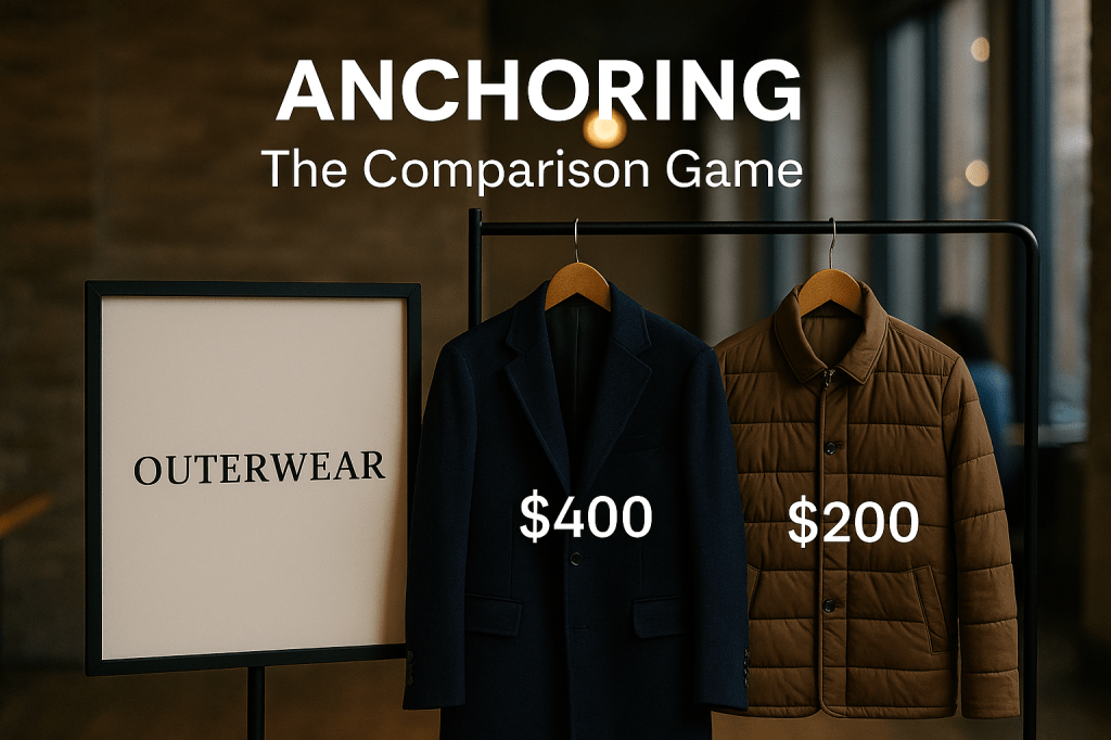 Anchoring occurs when a seller introduces a high-priced item to make other options look more reasonable. For instance, a clothing store might place a $400 coat next to a $200 coat. Few people will splurge on the $400 option, but the $200 one suddenly feels like a smart, balanced choice, even if it’s still more than you intended to spend.