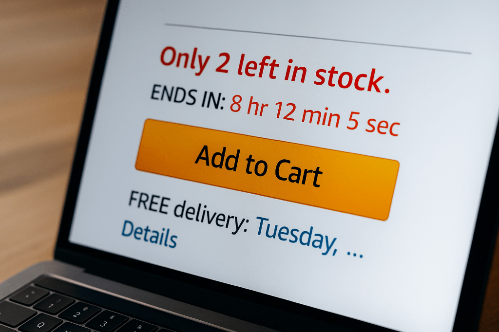 “Only 2 left in stock.” “Sale ends at midnight.” These phrases play on scarcity and urgency, two powerful motivators. Psychologically, we have a fear of missing out (aka FOMO), and scarcity makes us assign higher value to limited items. While these tactics sometimes reflect real stock or deadlines, they’re often just strategies to push you to buy now instead of later.